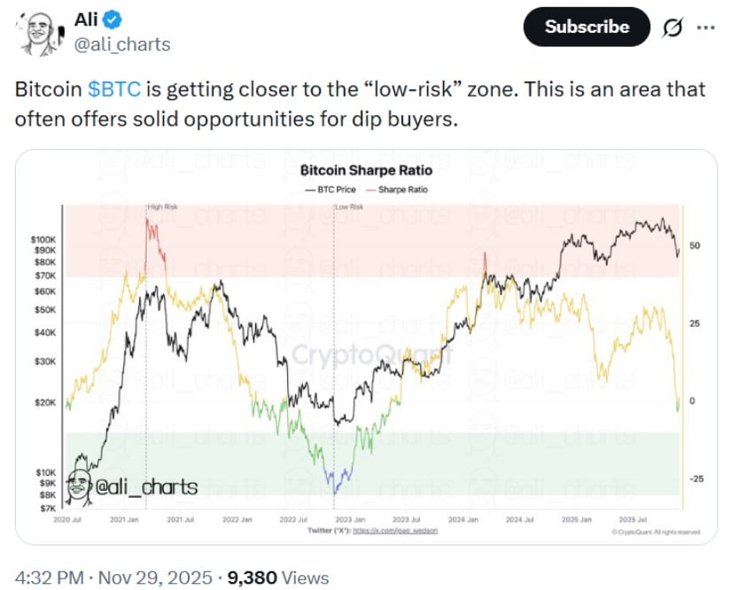 分析师Ali(@ali_charts)的独立研究指出积极的链上信号。通过比特币夏普比率指标,Ali发现资产正进入"低风险"区域:"该区域通常为逢低买入者提供绝佳机会。"