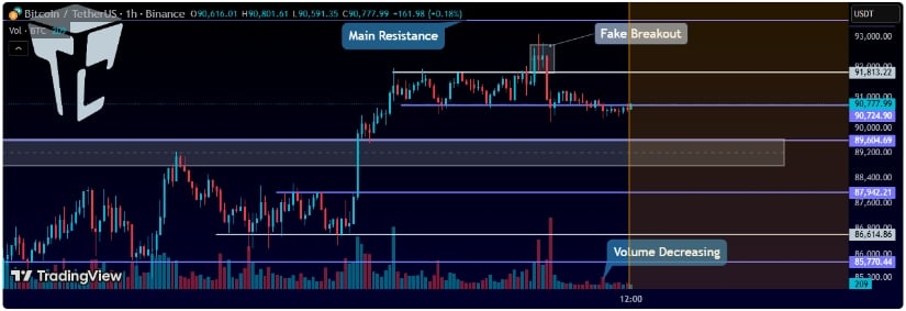 周末低成交量将比特币拖入90.7K美元附近的无趋势震荡区,需突破93,555美元上方或跌破89,000美元才能确立新方向。来源:TradingView上的tradecitypro