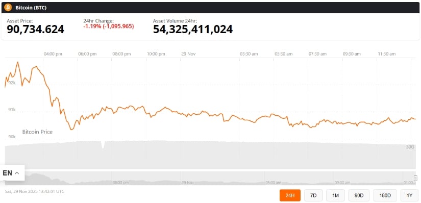 截至发稿时,比特币报90,734美元,24小时跌幅1.19%。来源:Brave New Coin比特币价格