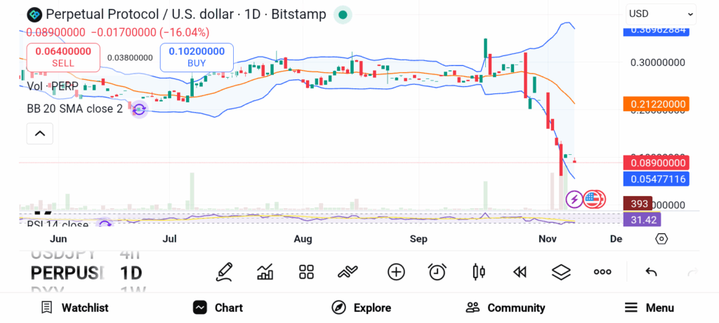 Perpetual Protocol支持用户通过永续合约进行加密资产杠杆交易。该平台采用专用AMM模型确保衍生品合约流动性。尽管是DeFi领域重要参与者,PERP仍受全球流动性紧缩冲击。过去一个月内,该代币跌幅达65.87%,反映出衍生品生态信心衰退。