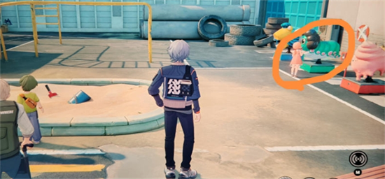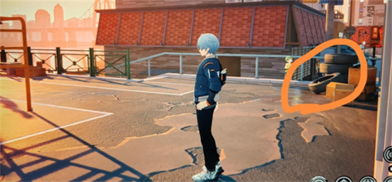 4、还是这里,火锅店后面,把时间调成夜晚,在上完楼梯后,前面有个轮胎,里面有个纪念币;