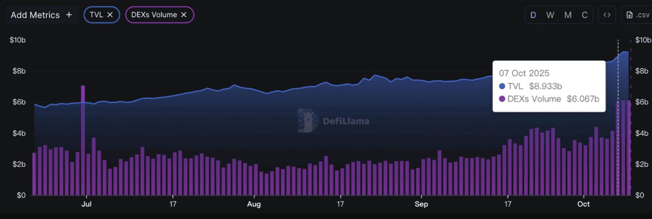 在持续进行的BNB 迷因季期间,BNB Chain 上的每日去中心化交易所 (DEX)交易量突破 60 亿美元,超过 10 万名新交易者加入迷因币市场。币安人生 (Binance Life) 和 哈基米 (Hakimi) 等代币占据了大部分流动性,证明社群驱动的投机可以启动整个网络。