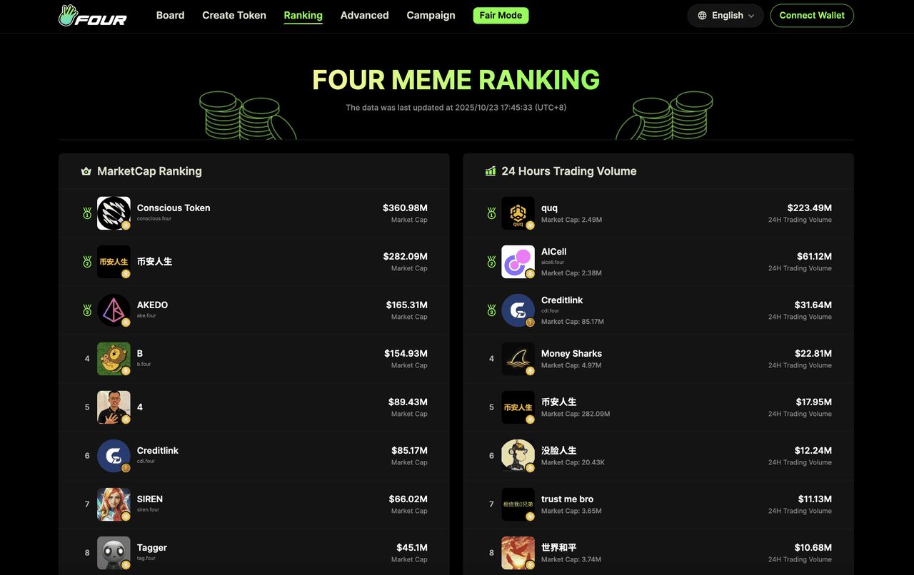 Four.meme 是 BNB Chain 上最具影响力的迷因币发射平台,也是 BNB 迷因季的起点。它允许任何人在几分钟内铸造和上架迷因币,并配备自动流动性和社群 交易集成。在其高峰期,该平台在单日内发行了超过 20,000 个代币,使其成为中文迷因币热潮背后的主要引擎。