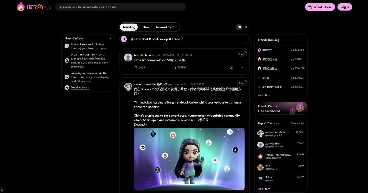 在长期由英语用户主导的加密货币领域,华人交易者现在是最大、最活跃的社群之一。迷因币为他们提供了一种通过自己的语言表达幽默和归属感的方式。基于 Solana 的索拉拉 (Solala) 及其发射平台 Trends.fun 是少数专为华语用户创建的生态系统之一,为当地参与创造了新的切入点。
