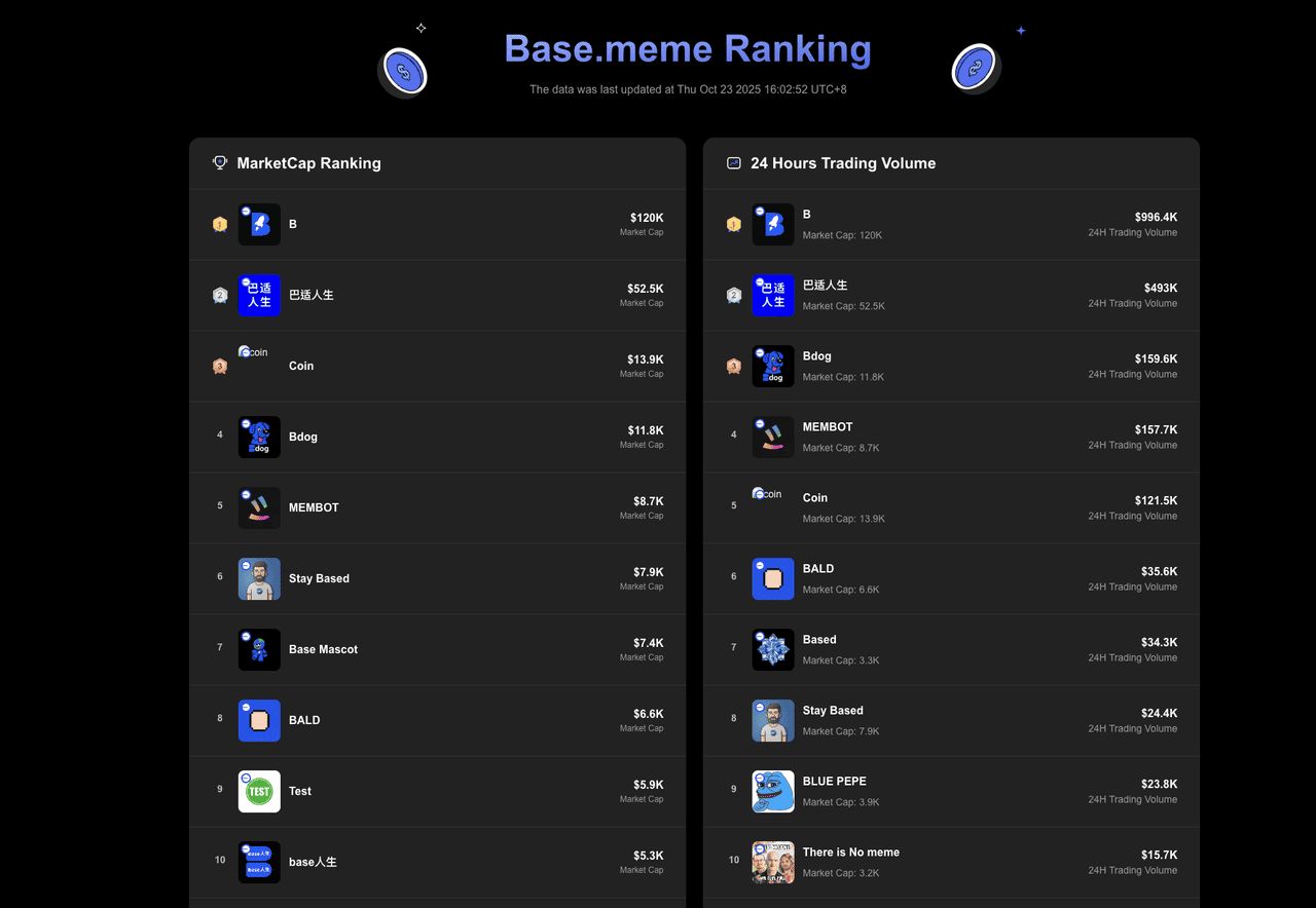| Base人生 (Base Life) | Base | 10M | 源自 Jesse Pollak 病毒式传播的「在 Base 上启动币安人生模式」贴文;标志着 Base 进入亚洲迷因市场。 |