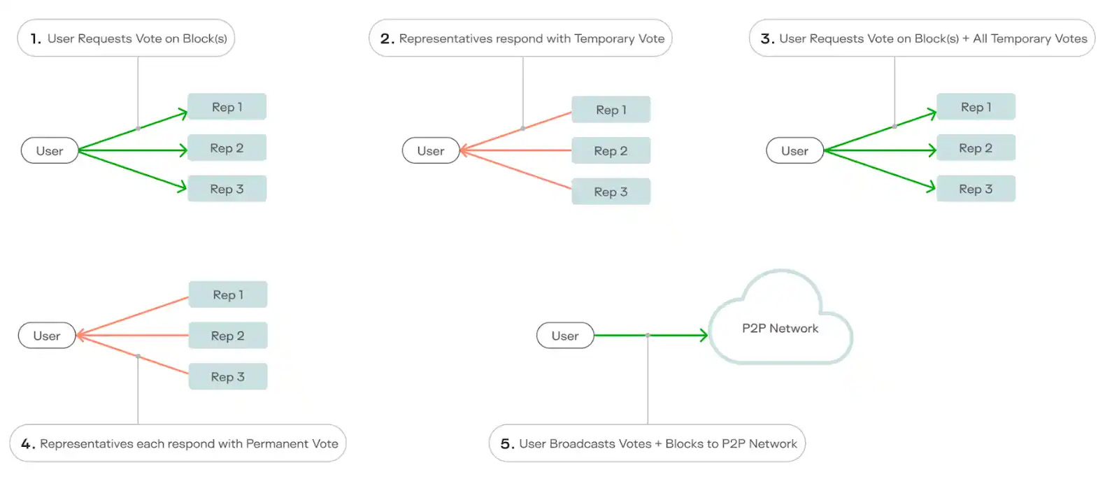 用户/客户端对需要批准的新区块进行投票。网络上的几个代表节点通过暂时批准该区块做出反应。用户请求验证代表发送的临时投票。然后,网络代表通过发送永久投票来验证临时投票和区块。最后,用户通知网络永久批准,以便将区块永久写入 Keeta 的记录账本。下图概括了此过程。