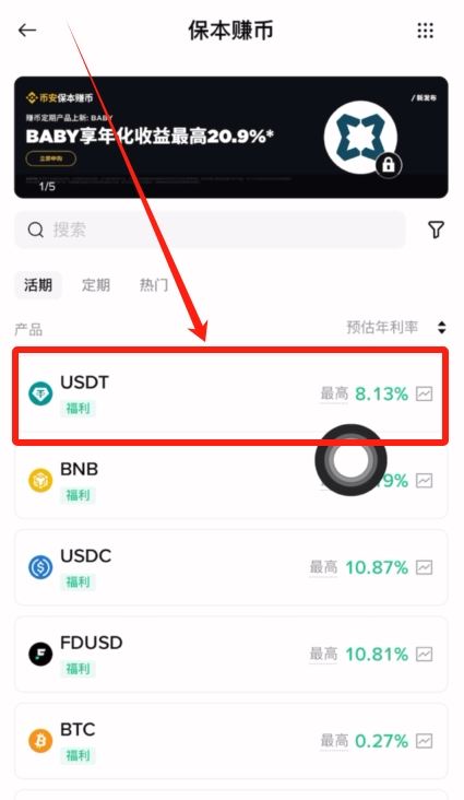 我就以USDT为例来给大家演示,你可以在右边看到它最高可以获得8.13%的收益。