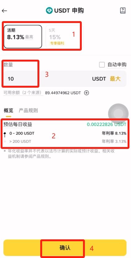 进来之后你可以在上方看到它有活期,还有5天的,这个5天的已经没有了,活期是最高8.13%的收益。在下方预估每日收益这个地方你可以看到,我们申购200USDT可以获得年化8.13%的收益。这个申购很简单,大家只需要输入要投入的数量就可以了。比如说我投入10颗USDT,点击【确认】。