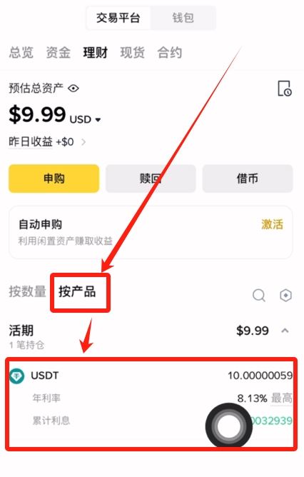 在下方点击“按产品”,就可以看到我们刚才申购的USDT了,我们点击它。