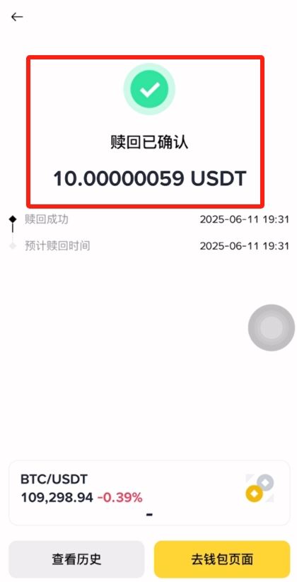 这时候就自动帮我们赎回了,操作的方法很简单。想要在币安赚取年化收益的朋友快去试一试吧。
