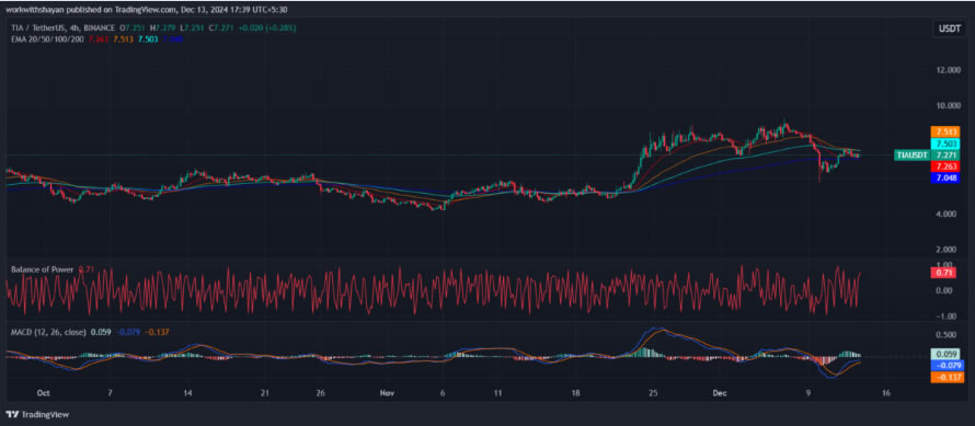 4 小时 TIA 价格图表表明,TIA 继续在 7-7.5 美元之间经历剧烈波动,从而在价格图表上造成负面情绪。由于价格目标维持在均线上方,多头旨在加强其主导地位。