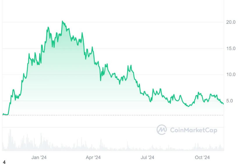 Token于2023年10月31日进入市场,价格为2.10美元。11月10日进入看涨阶段,11月18日见顶7.38美元。由于Binance好消息,价格下跌,到 11 月 27 日跌至 5.30 美元。12月24日达到历史新高15.14美元。全年收盘价为 11.86 美元。2024 年 3 月 11 日跌至 16.23 美元。5 月份的最后几周,价格已跌至 10 美元以下。不过,由于Bitcoin强势回归,TIA价格近期重回10美元大关。随着Bitcoin在 6 月和 7 月最近几天跌至 5 万美元,TIA 价格大幅下跌。这使得 TIA 价格跌破 5 美元。8 月最近几周,TIA 的价格大幅下跌,跌破 4.2 美元。搜索...11 月份,TIA 的购买需求不断增加,其价格被推向 9 美元。