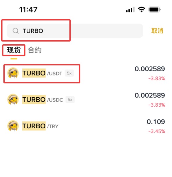 3、输入【TURBO】,这时下拉会显示【现货】【TURBO/ USDT】,点击【TURBO/ USDT】。(作为新手,不建议做合约,所以这里就不演示合约购买方式了。)
