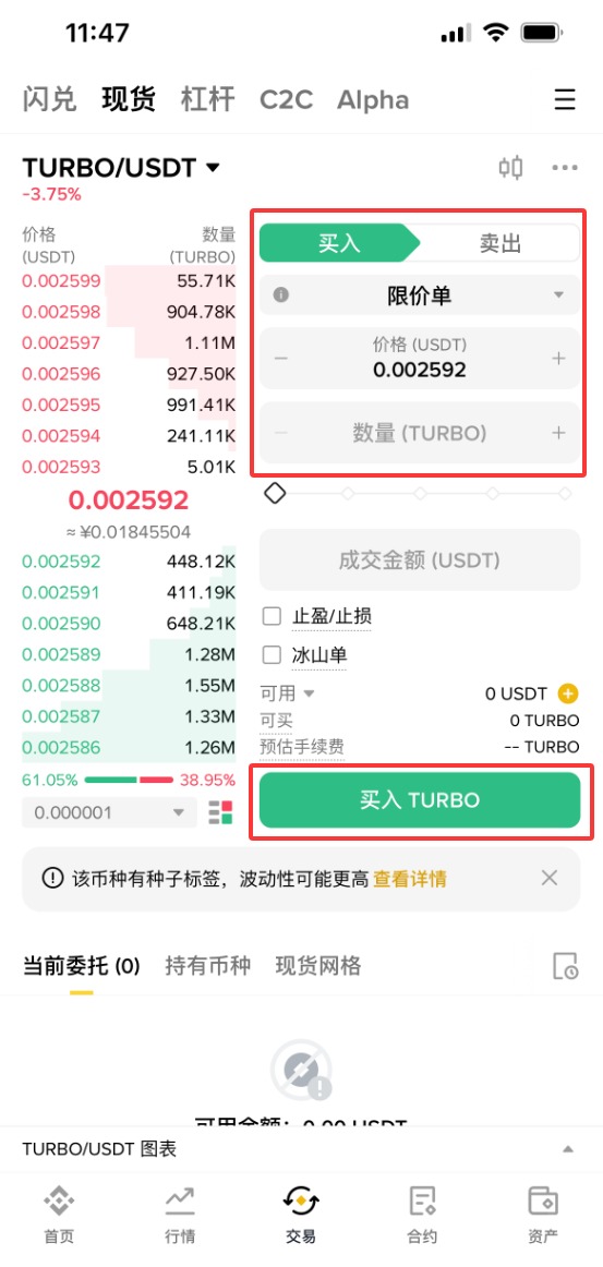 下面以币安为例,为大家演示TURBO币购买步骤教程。