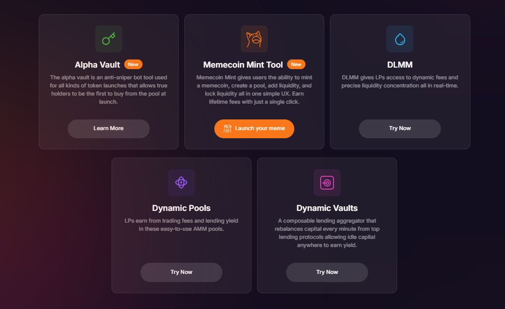 Meteora 专注于在加密领域提供流动性,旨在创建一个庞大的流动性提供者社区。它提供去中心化流动性管理的工具,包括自动化交易、手续费分析以及针对代币发行的反狙击机器人保护。其主要产品包:DLMM(动态流动性管理模块)、动态池、动态金库、多代币稳定池、非锚定稳定池、集成锁仓流动性的 memecoin 铸造服务等。Meteora 还举办社区活动和教育训练营,以帮助流动性提供者(LP)在像 Solana 这样的平台上获得最大化收益。