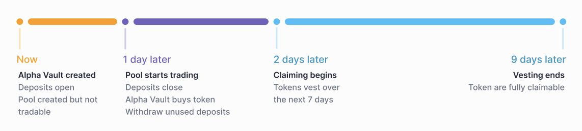 创建 Alpha Vault 后,还需要完成四个步骤。第一步是存款期,这一过程发生在代币发行之前,因此金库用户是最早获得代币的人。在此期间,用户可存入或提取 USDC。存款期结束后,金库将用存入的 USDC 购买代币。完成代币购买后,金库将对外开放,任何人都能进行交易并提供流动性。所有这些步骤完成后,金库中的所有代币将解锁,代币的归属期也将启动。