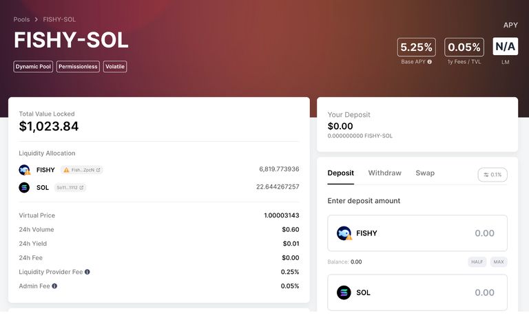 访问动态池设置页面并选择迷因币选项。在此处选择任意迷因币和交易配对的 SOL 或 USDT(或选择其他可用代币)。选择代币后,用户可为每个代币存入初始金额。填写所有必填字段后,池子将被创建,用户将来到新池的详情页面,如下所示。