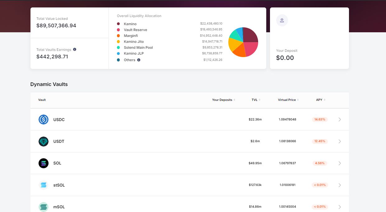 下图显示了来自不同分配器(如 Kamino、Vault Reserve 和 Marginfi)的金库中锁仓的价值。它包括特定代币的总锁仓价值(TVL)、虚拟价格以及计算的年化收益率(APR)。