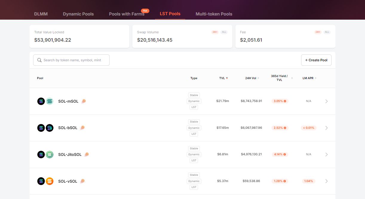 Meteora 的 LST(Liquid Staking Token)流动质押代币池旨在用于支持那些由于质押收益不断分发而导致其价值变化的代币,例如 bSOL、mSOL、LST 或 JitoSOL,这些代币通常与 SOL 配对交易。这些池主要通过提供质押代币的收益生成特性,使 LST 创造者、流动性提供者和用户受益。LST 保护用户免受无常损失,并通过链上程序提供更稳定的价格,并避免使用第三方价格预言机。为了保护用户免受低滑点的影响,它采用稳定曲线 AMM 模型,将流动性集中,并优化通过像 Jupiter 这样的交换聚合器捕获的交易量,以便流动性提供者通过增加的交易活动赚取更高的费用收入。