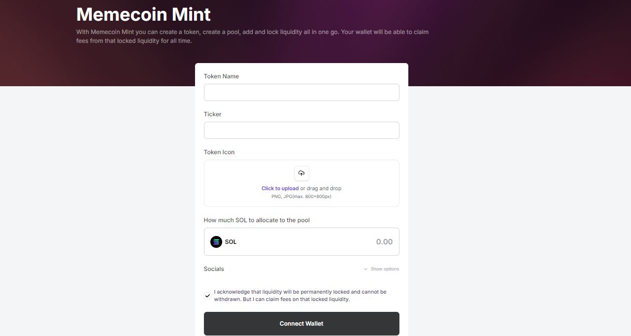 访问迷因币铸造页面。输入代币名称和代币符号(Ticker)。上传代币图标,支持 PNG 或 JPG 格式。输入要分配到池中的 SOL 数量。用户还可以提供网站和社交媒体链接(非必填项),以提高代币的可信度。点击接受条款和条件,然后点击“创建”按钮。