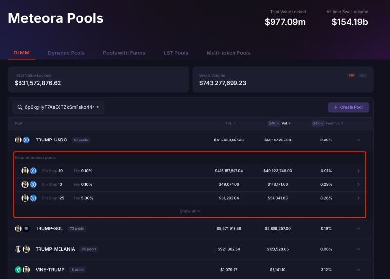 每个交易对下面可以有多个 Pools,每个 Pool 按 Bin Step 和 Fee(手续费)的不同来区分。比如 trump - usdc 的交易对下面就有 57 个 Pools,每个 Pool 都对应一个唯一的地址,如图