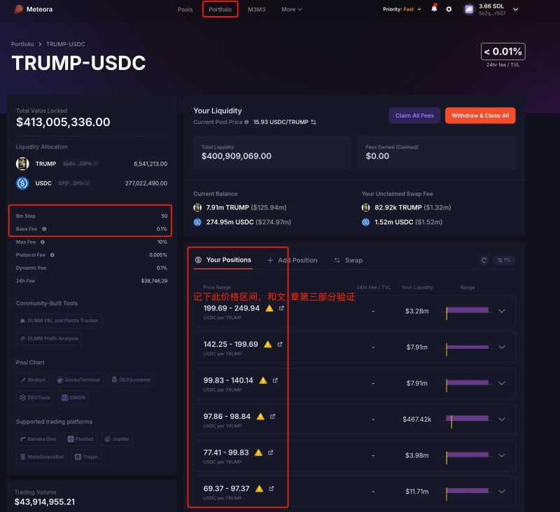 最后,打开 Meteora 连接 Phantom 钱袋,点击顶部的【Portfolio】就能看到所有添加的池子,点击 DLMM 的任意一个池子,会显示池子的详情和所有的仓位,如图