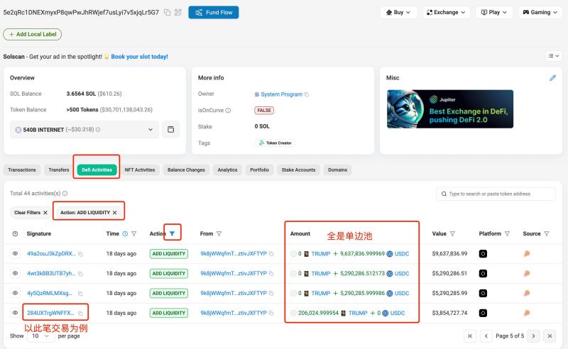 我们打开 solscan,输入 trump,要么只添加了 $usdc。本文以图中最后一笔交易为例,如图