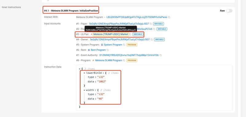 在交易详情页面往下查看,在【#4.1 - Meteora DLMM Program: initializePosition】 可以知道 lowerBinId 为 1062,bin 的宽度即个数为 46,池子地址为 9d9mb8kooFfaD3SctgZtkxQypkshx6ezhbKio89ixyy2,如图。