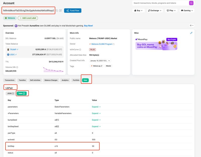 在 solscan 上打开池子地址 9d9mb8kooFfaD3SctgZtkxQypkshx6ezhbKio89ixyy2(https://s**olsca*n.io/account/9d9mb8kooFfaD3SctgZtkxQypkshx6ezhbKio89ixyy2),点击【data】标签页,在“LbPair”切换成“Table”,可以查到 binStep 的值为 50,如图
