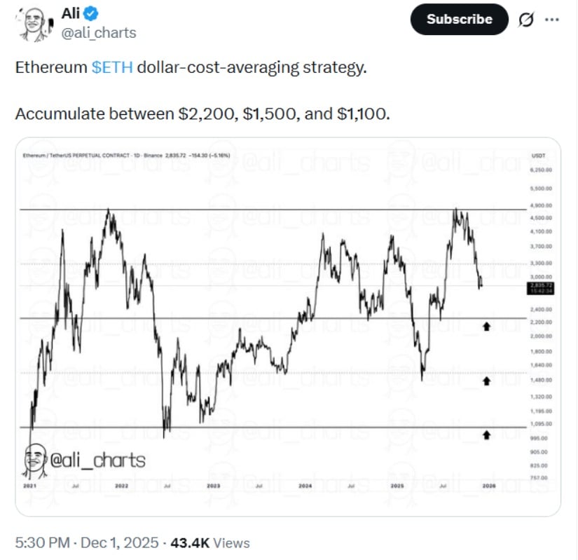 以太坊分析指出2,200美元、1,500美元和1,100美元为历史DCA关键区,对应典型30%-60%回撤及EIP-1559后长期供应紧缩。来源:Ali Martinez(X平台)