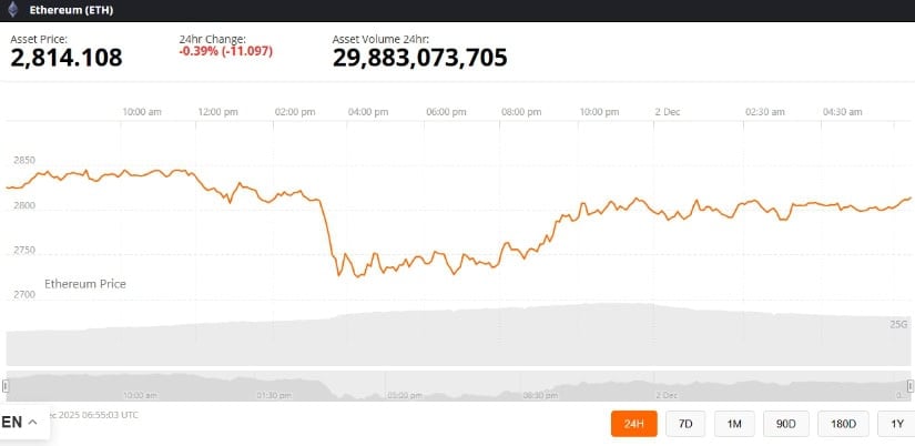 截至发稿,以太坊报2,814.10美元,24小时下跌0.39%。来源:Brave New Coin