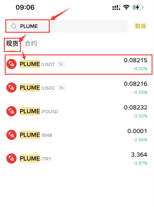 3、输入【PLUME】,这时下拉会显示现货PLUME/ USDT,点击【PLUME / USDT】。