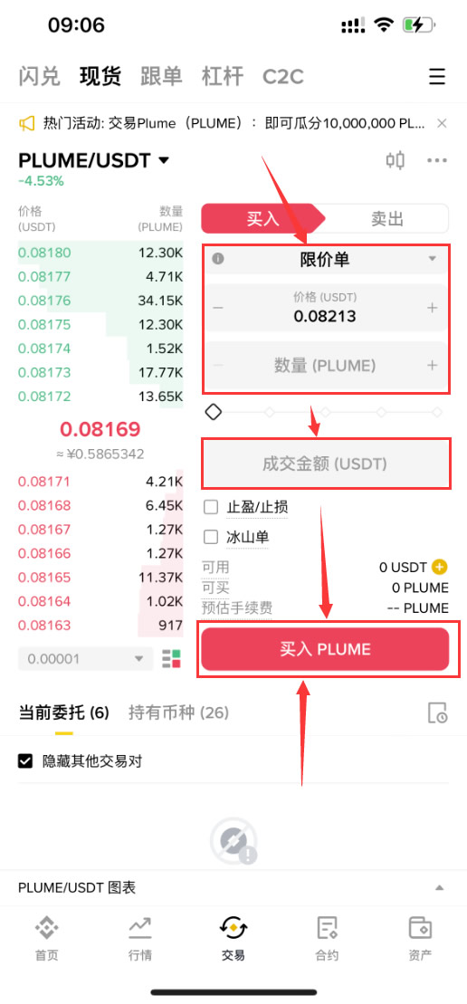 5、依次选择【限价单】-购买【价格】-购买【数量】-【成交数量】,设置好之后,点击【买入PLUME】。