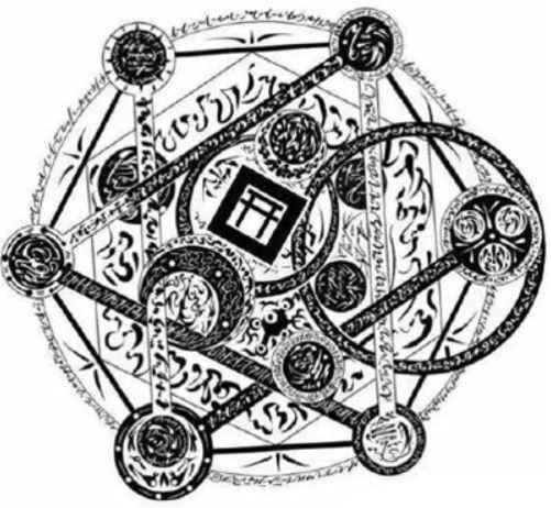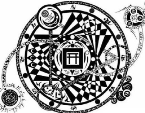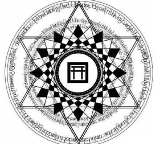 这个圆形符咒周围环绕着日月星辰,基础图形以三角形旋转重叠,正中间是黑白鸟居图案。