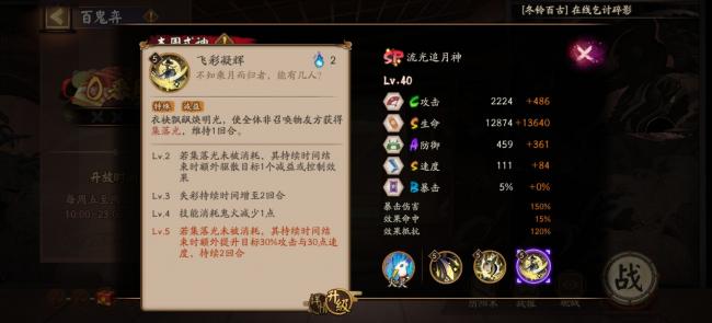 大招消耗三点鬼火给队友提升攻击和速度,并且队友没有消耗这个增益状态就会驱散其他队友的负面效果。大招的增益效果可以抵挡对面的扣火并且给对面鬼火条推相同的格数,也就是说千姬的扣火效果没用了。这个技能四级可以减少一点鬼火消耗,开大只用两点鬼火。三级提升持续回合数,五级提高增伤效果。所以想要使用流光追月神,十二颗黑蛋是必不可少的。