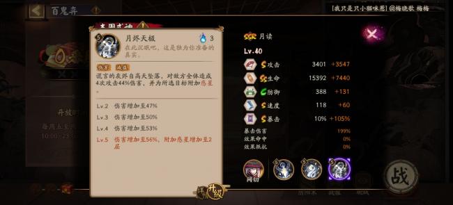 目前月读的技能是比较针对单体输出式神的,也就是斗技一霸须佐之男,但是月读的虚假之月比较脆,转移不了太多次攻击,反而针对单体控制效果比较突出,金莲这种印记是有概率转移的,所以月读更多的是斗技的策略卡。因为大招是多段但是倍率不高,也比较适合带日女巳时或者控制御魂干扰敌方行动回合。