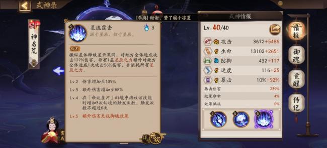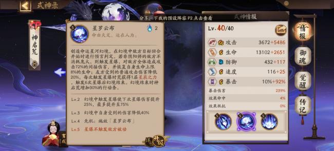 大招是根据二技能幻境叠的层数来计算后续的多段伤害的,技能升级后倍率增加,并且在幻境中开大招还能再增加三层幻境,叠的层数打出来的伤害是不触发御魂效果的,这个技能也需要拉满,对sp荒的输出能力是一个很大的增强。