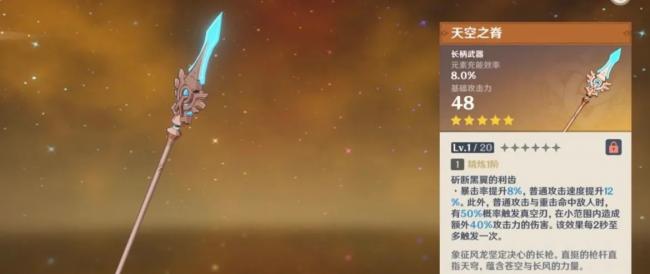 天空之脊虽然副词条加的是元素充能,但是对魈来说可以增加开大速度,快速打出循环,所以也是有用的。天空之脊的被动效果也比较适合魈,提升暴击的效果是比较实用的,并且还能提供普攻攻速加成。普攻、重击概率触发小范围伤害效果聊胜于无。