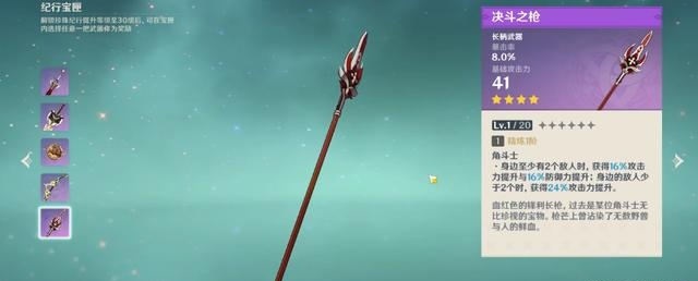 决斗之枪的副属性可以提升暴击,并且在身边敌人多于两个的时候可以获得少量的攻击提升,敌人少于两个的时候攻击提升更多。无论是对单还是对群都很实用。