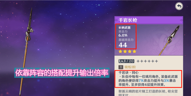 千岩长枪虽然是加攻击能力的,但是效果十分有趣,在队伍中搭配的角色都是璃月的角色时,一个可以让魈获得攻击加成和暴击加成,最多可以获得四层加成。魈通常配合钟离使用,所以加成效果必定可以吃到一层。但是想要拿到最高收益对阵容限制比较多。