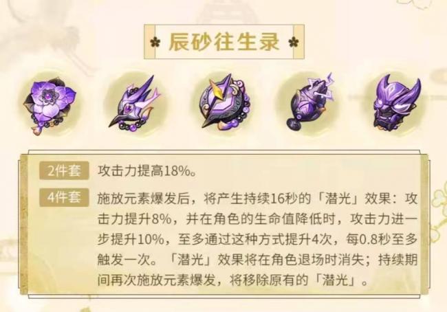 辰砂往生录是岩中幽谷产出的圣遗物,两件套属性是攻击加成,四件套的效果是在施放大招后生命值降低可吃到攻击加成,最多可以叠四层,对攻击力的提升很多。并且这个攻击提升效果是可以维持到角色退场的。魈开大招可以吃满这个加成效果,是比较适配的。