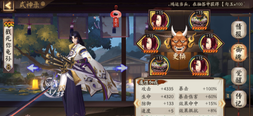 技能效果:妖刀姬的技能效果强在被动给自身堆爆伤,以及队友用八火可以额外打一次无消耗六段攻击,除了本身的攻击以外,队友的回合也能补输出,所以是比较适合刷副本的一个式神。被动暴击叠爆伤也需要两回合暖机,所以比较适合长线副本。