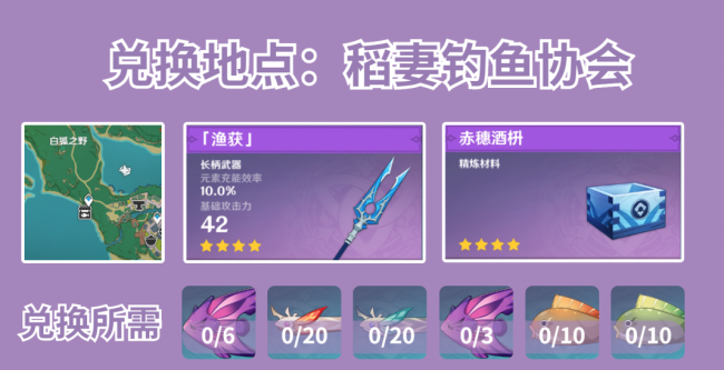 从白狐之野的传送点过去,在靠近水边的位置就能找到钓鱼协会,之后点开对话,就能看到可以兑换的商品,第一个就是渔获。兑换渔获需要收集雷鸣仙、金赤假龙和鲭假龙这些鱼类。想要钓到这些鱼也需要用到合适的鱼饵。飞蝇假饵和蠕虫假饵的配方可以去蒙德的钓鱼协会兑换。换取的材料是最常见的花鳉鱼,只需要初始的配方就能做出来,制作鱼饵的材料也是普通的日落果和小麦。