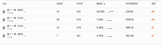 现在游戏的11章地图才刚开,材料【转质盐聚块】又是罕见掉落,所以单件期望理智可能现在还不能太准确的计算出来,但是通过综合的消息来看,11-15和11-3关卡之内应该都是可以刷的。另外,材料【转质盐聚块】合成所需要的【转质盐组】同样也是可以在这两关掉落,总体来说性价比算比较高的了。