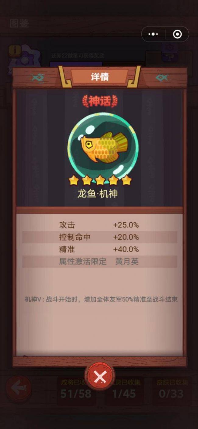 特别说明:黄月英在装备龙鱼·机神时,可以激活隐藏属性,使得战斗开始时,己方全体友军的精准+50.0%,并且一直持续到战斗结束!