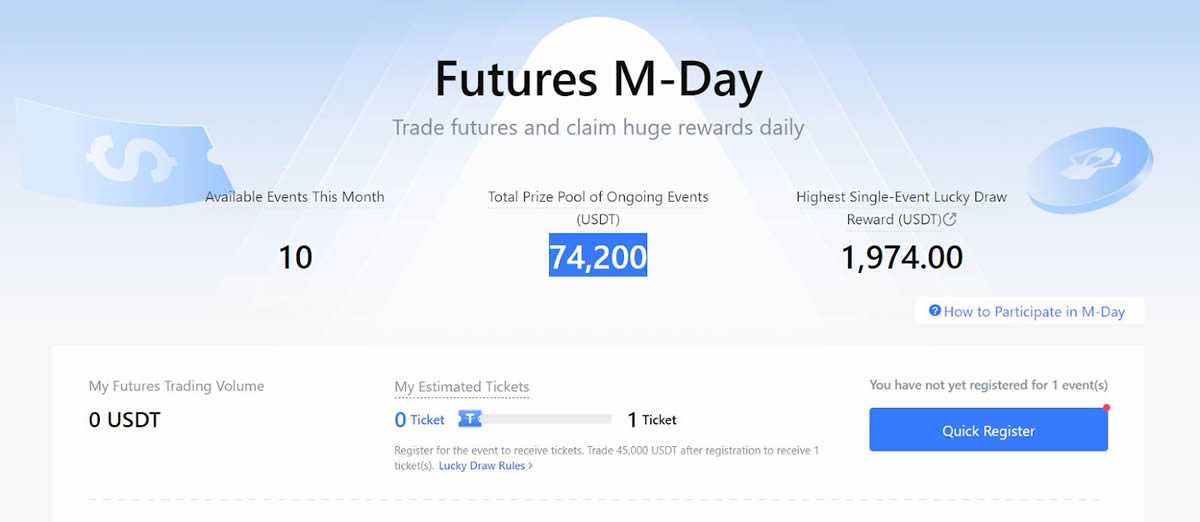 Futures-M Day 是MEXC交易所 (MEXC) 的一项活动,旨在鼓励用户参与期货交易,享受更低的手续费,并有机会赢取额外奖励。Futures-M Day 的精彩之处如下: