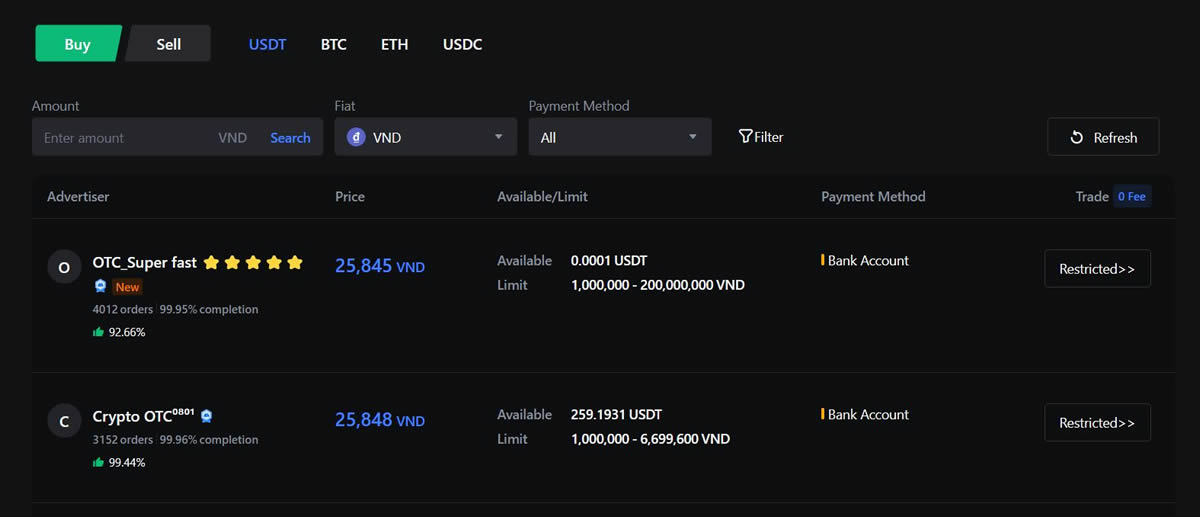 该交易所目前支持三种法定货币:越南盾 (VND)、俄罗斯卢布 (RUB) 和韩元 (KRW)。支持超过 30 种付款方式。您可以灵活选择方便的付款方式,例如银航转账或电子钱袋。