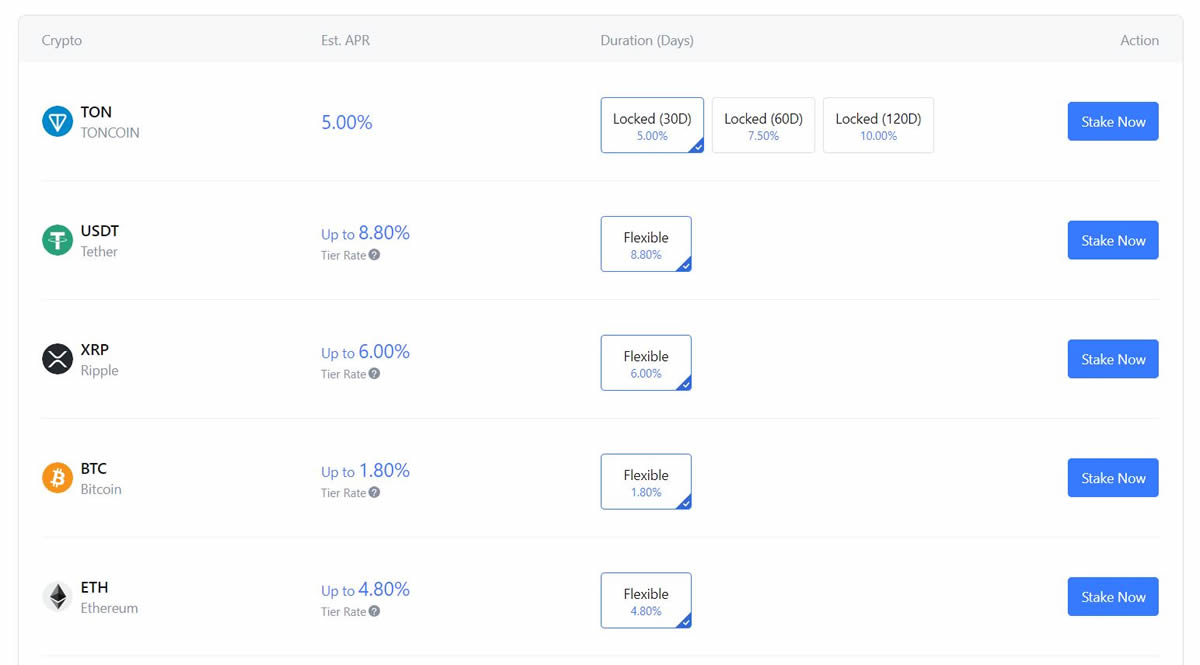 灵活的质押方式让您在赚取奖励的同时,还能保持随时提取资金的灵活性。通过固定期限质押,您可以将资金投入特定期限以获得更高的奖励,但您必须在质押期结束前才能提取这些资金。它提供 30 天、60 天和 120 天的固定期限质押选项。部分代币年利率最高可达 50%。目前,BTC 年利率为 1.8%,ETH 年利率为 4.8%,USDT 年利率为 8.8%。