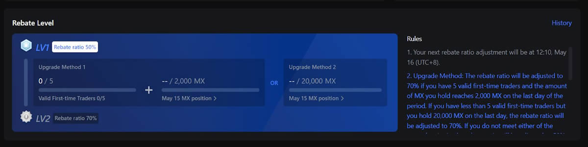 您获得的具体佣金金额取决于您账户中持有的 MX 代币数量。如果您没有持有任何 MX 代币,您仍然可以获得可观的 30% 佣金。持有 5,000 至 20,000 枚 MX 代币,您的佣金将从 30% 增加到 70%。最棒的是,从您推荐的会员注册之日起,您将持续获得长达 1080 天(3 年)的交易佣金。