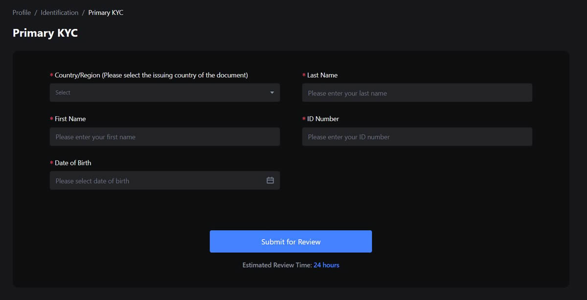 前往您的个人资料部分,选择“验证”。现在,您有两个选项:主要 KYC 或高级 KYC。请选择适合您需求的选项。验证最多可能需要 24 小时。